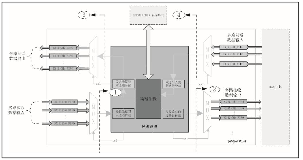 (1)發送處理部分:邏輯接收HOST主機的數據,然后根據仲裁邏輯的優先級策略分通道寫入SDRAM (DDR)中進行緩存(寫操作),在發送的下游數據接口,仲裁邏輯再從SDRMA(DDR)中讀取數據發送到相應的通道出口中去