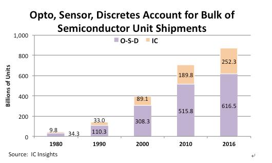 雖然集成電路技術(shù)不斷發(fā)展,越來(lái)越多的功能被集成到一顆存儲(chǔ)芯片中,從而以系統(tǒng)的角度來(lái)看用到的芯片數(shù)量越來(lái)越少,但I(xiàn)C Insights的統(tǒng)計(jì)結(jié)果顯示,全球半導(dǎo)體出貨量中,集成電路占比依然很低,而光電器件、傳感器與分立器件(Opto-Sensor-Discrete,簡(jiǎn)稱O-S-D)的比重仍然超過七成。