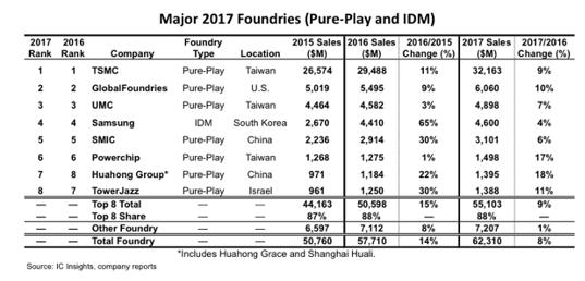 根據IC Insights最新研究報告顯示,2017年全球八大晶圓廠商銷售額總計達551.03億美元,同比增長9%,比2016年的15%增速有所放緩。這8家廠商2017年的市場份額達到88%,市占率與2016年相同。