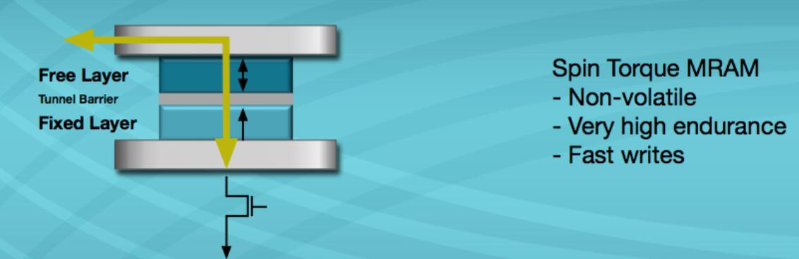 everspin的最新MRAM技術利用自旋轉矩傳遞特性,即利用極化電流操縱電子的自旋,以建立自由層的所需磁狀態,以對存儲陣列中的位進行編程或寫入。