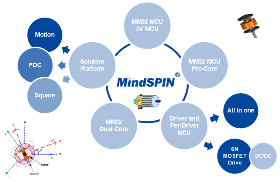 SPIN是旋轉(zhuǎn)的同義詞,再注入靈動微電子的靈魂Mind,表示靈活與專業(yè)。包含了三大主軸:專業(yè)MCU,專用驅(qū)動MCU微控制器及解決方案平臺。專用MCU的獨特之處是帶領(lǐng)了許多主流應(yīng)用,如:電動車的應(yīng)用,目前市場的占有率仍然保持領(lǐng)先地位;專用驅(qū)動型MCU微控制器電壓范圍從20V至600V。例:MM32SPIN222C集成了三相MOSFET、預(yù)驅(qū)以及LDO,可讓小空間發(fā)揮最大的功能,同時內(nèi)建了高性能32位的Arm Cortex-M0內(nèi)核為運算核心,讓開發(fā)更為簡單快捷;解決方案平臺由擁有超過10年以上算法開發(fā)經(jīng)驗的MindSPIN團(tuán)隊精心打造,按技術(shù)方式分為方波、旋波FOC以及位置控制三類,按應(yīng)用方式可分為風(fēng)機(jī)、電動工具、微電機(jī)、家電以及電動車五大類,同時靈動微電子還提供了不同的相對應(yīng)的特色