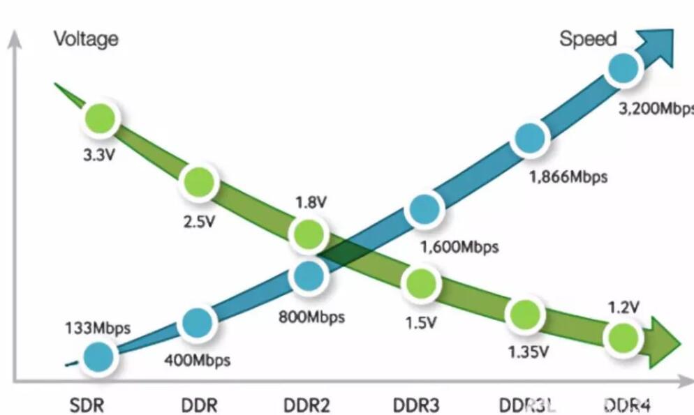 從DDR到DDR4,不同性能參數差異主要體現在2個地方:電源電壓、數據傳輸速率。電源電壓值越來越低,而數據傳輸速率卻是呈幾何倍數增長。