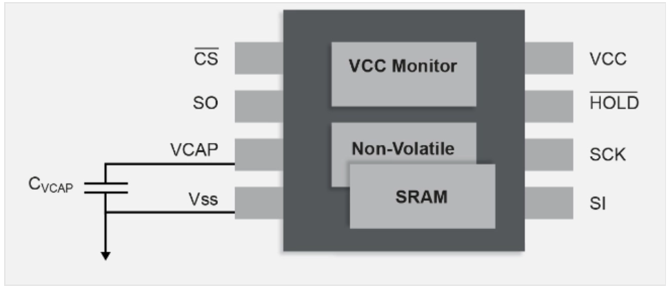 串行SRAM,在器件內(nèi)部的每個單元中都包含非易失性晶體管。與NVSRAM不同,它不需要外部電池。它使用一個小的外部電容器來提供當(dāng)系統(tǒng)斷電時將SRAM的內(nèi)容移動到非易失性單元所需的能量,這是通過IC監(jiān)視公共集電極上的電壓并自動處理SRAM和SRAM之間的數(shù)據(jù)移動來實現(xiàn)的。必要時使用非易失性存儲器。