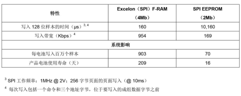 FRAM和EEPROM寫入數據所需的能量??梢钥闯鰧τ谶@種應用而言,FRAM消耗的功耗顯著降低。極低功耗深度待機模式和休眠模式可進一步改善功耗,從而進一步延長設備的電池使用壽命。