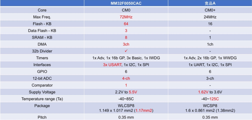 MM32F0050 WLCSP8封裝與同為WLCSP8封裝的競品A的主要參數(shù)對比: