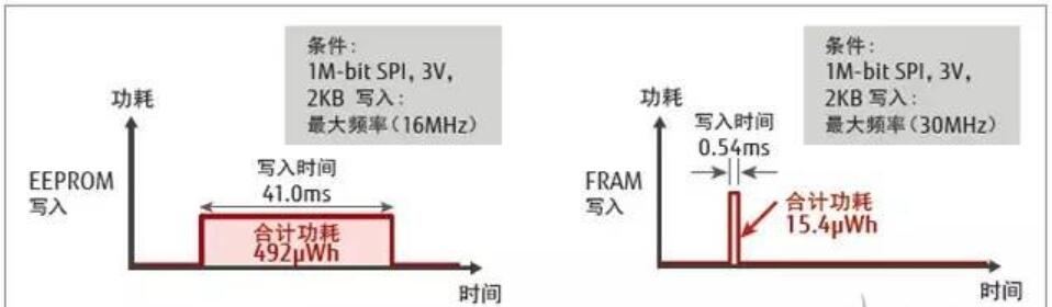 另外與同為非易失性存儲器的通用EEPROM相比,MB85RS1MT的寫入時間較短,從而能夠大幅降低寫入時的功耗。