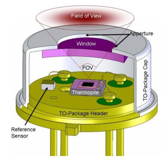 一般采用金屬外殼封裝,物料的紅外射線經(jīng)過表面的濾光片進入到里面的熱電堆電偶上,再經(jīng)過信號感應轉(zhuǎn)換成電信號。
