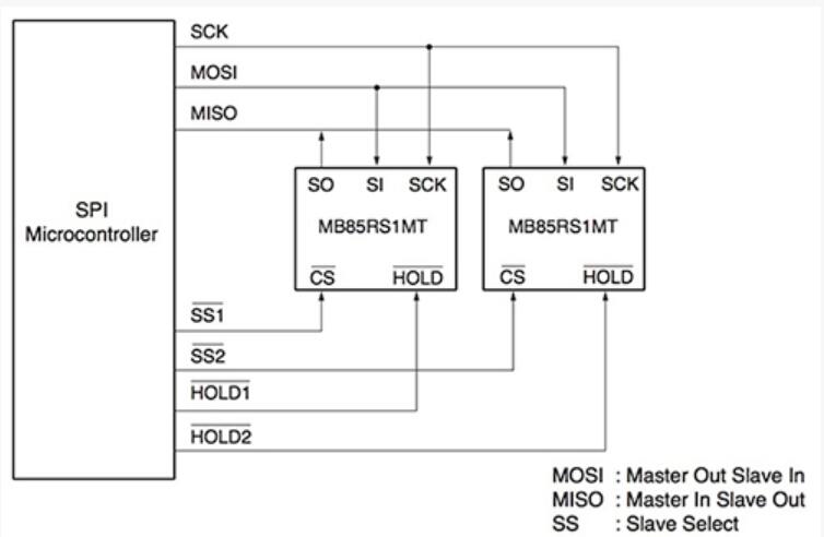 圖1:設備,如富士通MB85RS1MT允許使用熟悉的主/從配置為SPI-配備的MCU - 或使用使用設備的SI和SO端口,用于非基于SPI的設計,簡單的總線連接解決方案。 (富士通半導體提供)