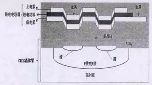 鐵電存儲器是一種掉電后信息不丟失的非易失存儲器,具有高密度、高速、低功耗和抗輻射等優點。其核心基礎是鐵電晶體材料,采用鐵電效應作為其電荷存儲機制,同時具備隨機存取存儲器(RAM)和非易失性存儲產品的特性。其結構圖如下圖所示。FRAM的工作原理是利用金屬-鐵電-半導體場效應晶體管結構,鐵電薄膜用來替代MOS管中的柵極氧化硅層,鐵電薄膜保持著兩個穩定的極化狀態,分別表示“1”和“0”。