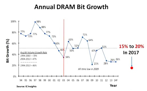 美光(Micron)表示,2017年DRAM供給位元預計成長15-20%,可說是近20年來最低的位元成長率(bit growth)。如此低的位元成長率,主要是因為DRAM微縮限制。市場上有很長一段時間都沒有任何有關DRAM微縮的消息了。當供給位元成長低于45%時,這時就是賣方的市場了。因此,DRAM的寡頭壟斷、低位元成長率,以及制造擴張遲緩,導致長期的供應吃緊。最終的局面可能就是DRAM的價格不斷上漲,而供應面卻不會有任何改變。