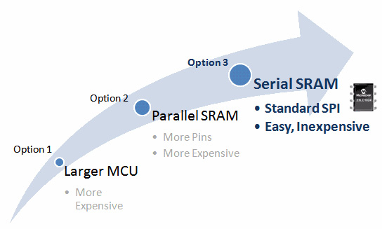 3. 串行SRAM現在支持向設計中靈活添加RAM,而不會帶來大型單片機或并行RAM的缺點,它使用簡單的4引腳SPI接口。 SDI和SQI接口可將數據速率提高4倍,這些器件還會通過這兩個接口來提升性能。